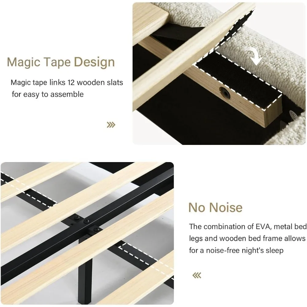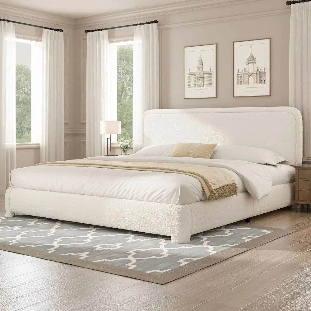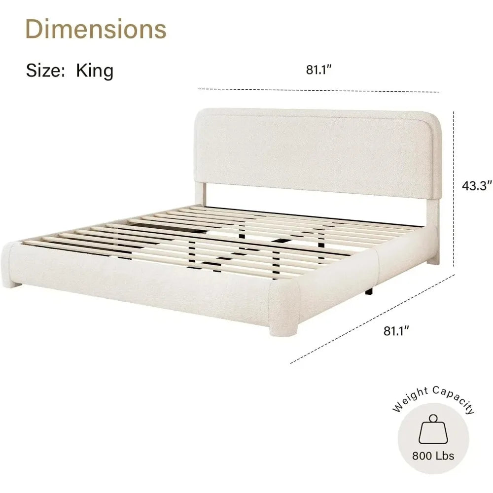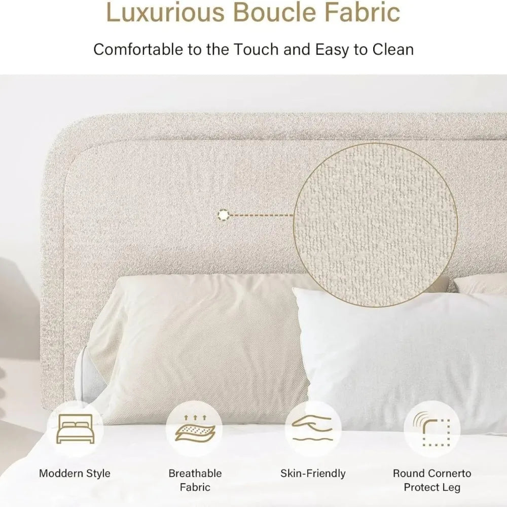 - 【Fluffy Boucle Fabric】The cream-colored king size bed frame is upholstered in a cloud-like terry fabric that is soft to the touch while providing a fluffy texture. Boucle fabric all-over fabric cover for bold style, filling your home with warmth and calm so you can sleep in style