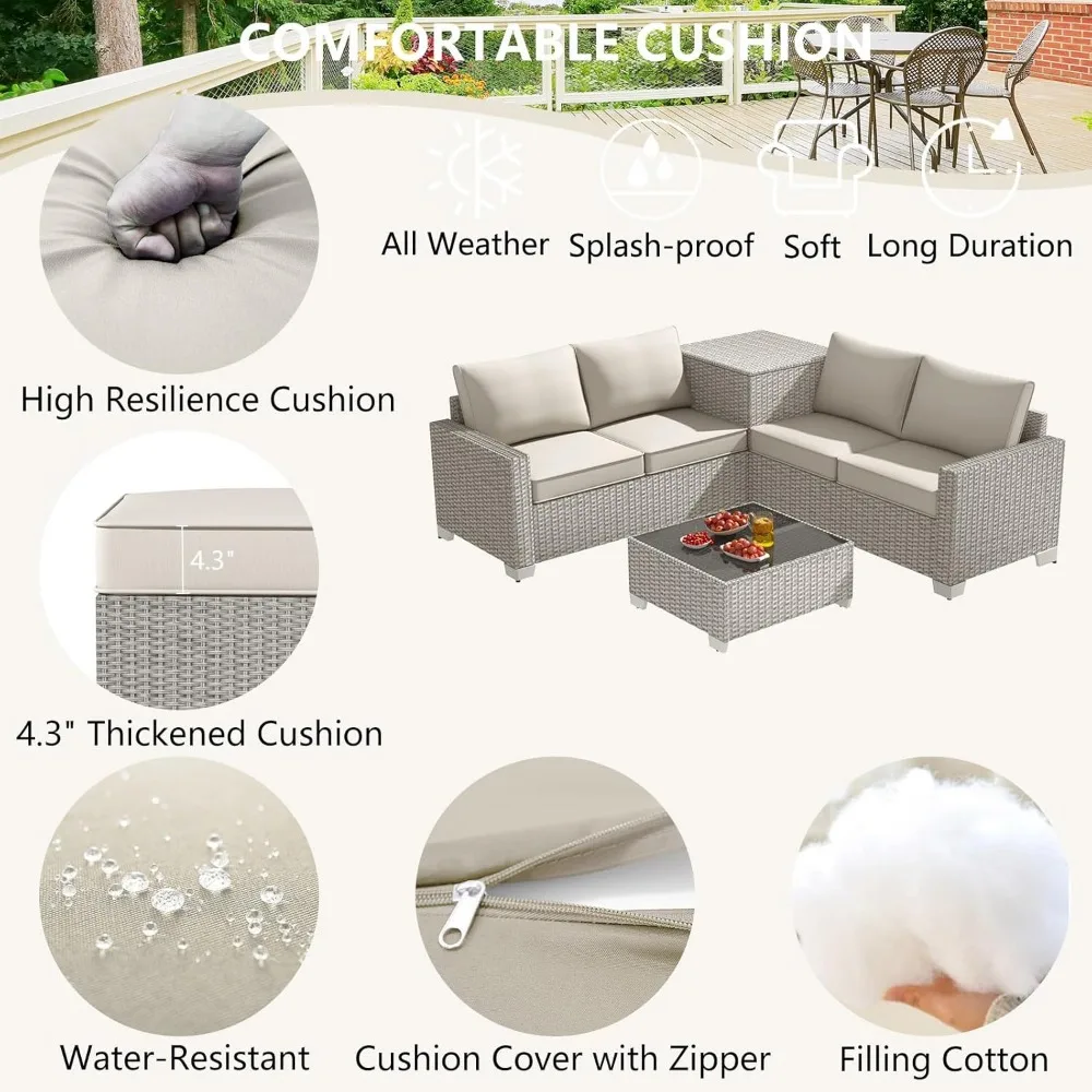 4-Seater All-Weather Outdoor Patio Furniture Set with Storage & Table, L-Shaped Sectional Sofa