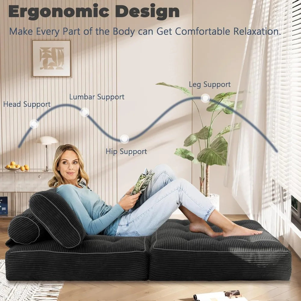 - 3-in-1 Folding Functionality:Enjoy with this portable large bean bag chairs for adults that offers three distinct configurations. Use it as a floor sofa chair for reading, unfold it into a foldable lazy sofa bed for guests, or extend it as a supportive mattress for additional sleeping space. Transitioning between forms is seamless, allowing you to maximize functionality without compromising on comfort