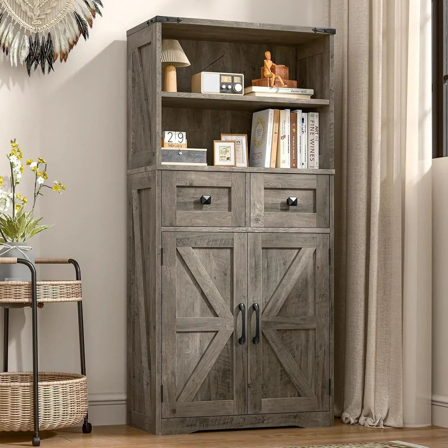 【Rustic Charm and Elegant Design】 Characterized by its farmhouse-inspired charm, this cabinet features a top board adorned with decorative angle iron accents. This rustic embellishment adds a touch of elegance and visual interest, perfectly complementing the cabinet's sturdy construction and enhancing its appeal as a focal point in any room.