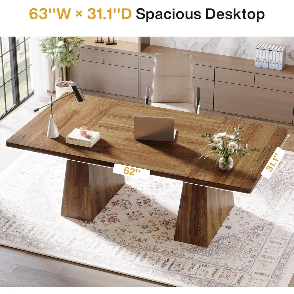 This office desk features a sleek black finish and a minimalist design that embodies modern elegance. Its smooth, curved edges and bold double pedestal base contribute to a refined and authoritative look, making it a sophisticated centerpiece in any executive office environment. The desk offers a generous workspace, measuring 63 inches wide and 31.1 inches deep, providing ample room for multiple monitors, documents, and office supplies, ensuring a comfortable and efficient work area. With a height of 29.53 inches, it also provides plenty of legroom, allowing for ease of movement underneath the desk. Constructed with a 1.18-inch thick desktop and sturdy wood legs, this computer desk can support a weight capacity of up to 250 pounds, offering a solid foundation for your work. The double pedestal base enhances its stability, preventing wobbling or shifting during use. Beyond office work, this executive desk's versatile design makes it suitable for a variety of uses, including a home office desk, conference table, gaming station, or craft table. Its adaptability ensures it meets the diverse needs of your professional environment. Assembly is hassle-free with an included step-by-step guide, and all necessary parts and tools are provided. Additionally, the desk comes with an 18-month warranty and dedicated customer service for quick replacements in case of any quality issues.